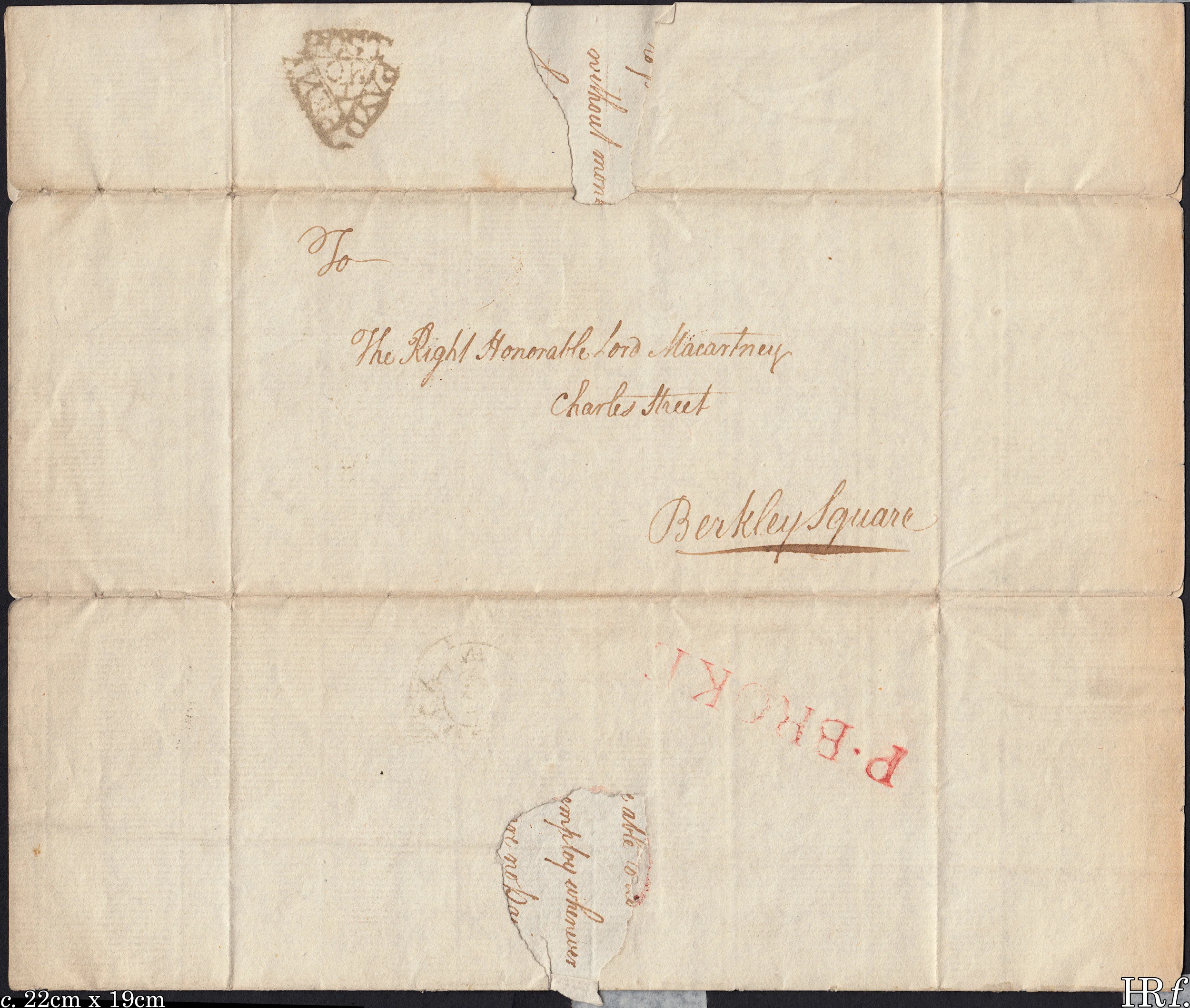 I'm not quite philosophic enough to be able to decipher the postal markings here: we have a triangular London Penny Post mark, a very faint circular Bishop Mark and a red "P'Broke" arrival mark: what this is doing on a London -> London letter I have no idea whatsoever.